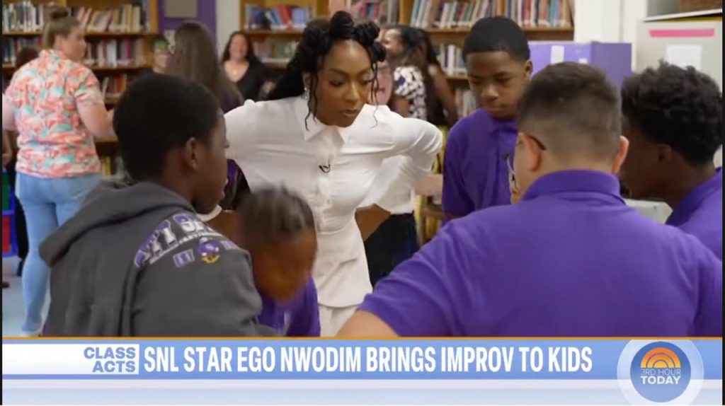 NBC’s The Today Show followed SNL star Ego Nwodim over her August 2024 visits to all six BCP schools to teach improv skills to educators and to City Springs’ student peer mediators. Her unique program focuses on listening and life skills, inspired by improv techniques.
