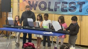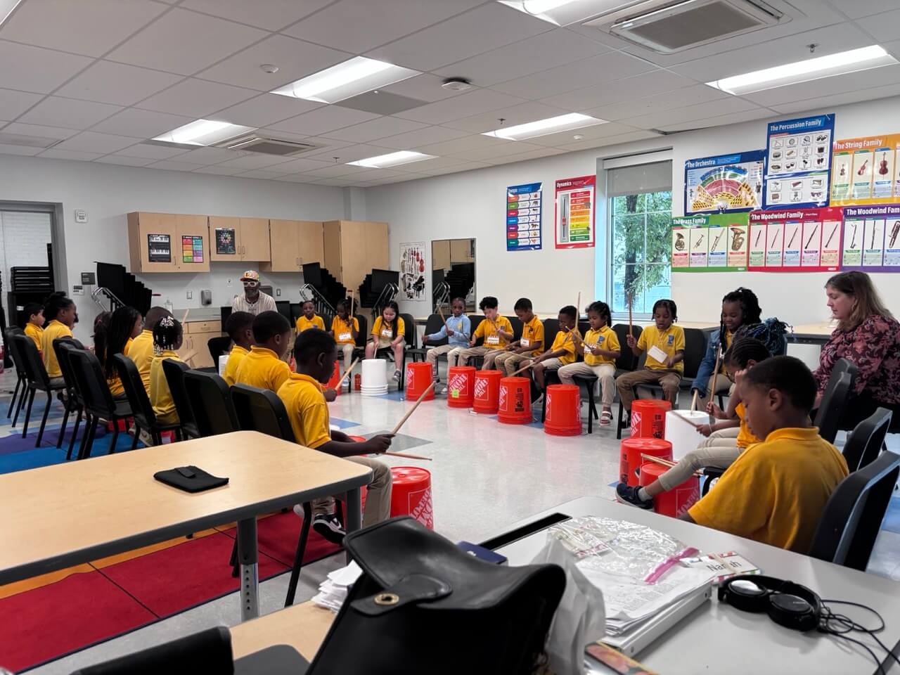 We just added Frederick Elementary School for half-days, and it’s going great!  We’re teaching 3rd through 5th grades there. Instead of the saxophone, we’re teaching recorders. Each kid has his/her own recorder. We also have bucket drums and music production. The students there are getting a good spectrum of activities.