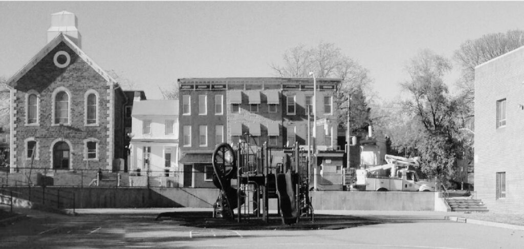 View of the school's playground, neighboring houses and church, looking north from playground, Ca. 2013