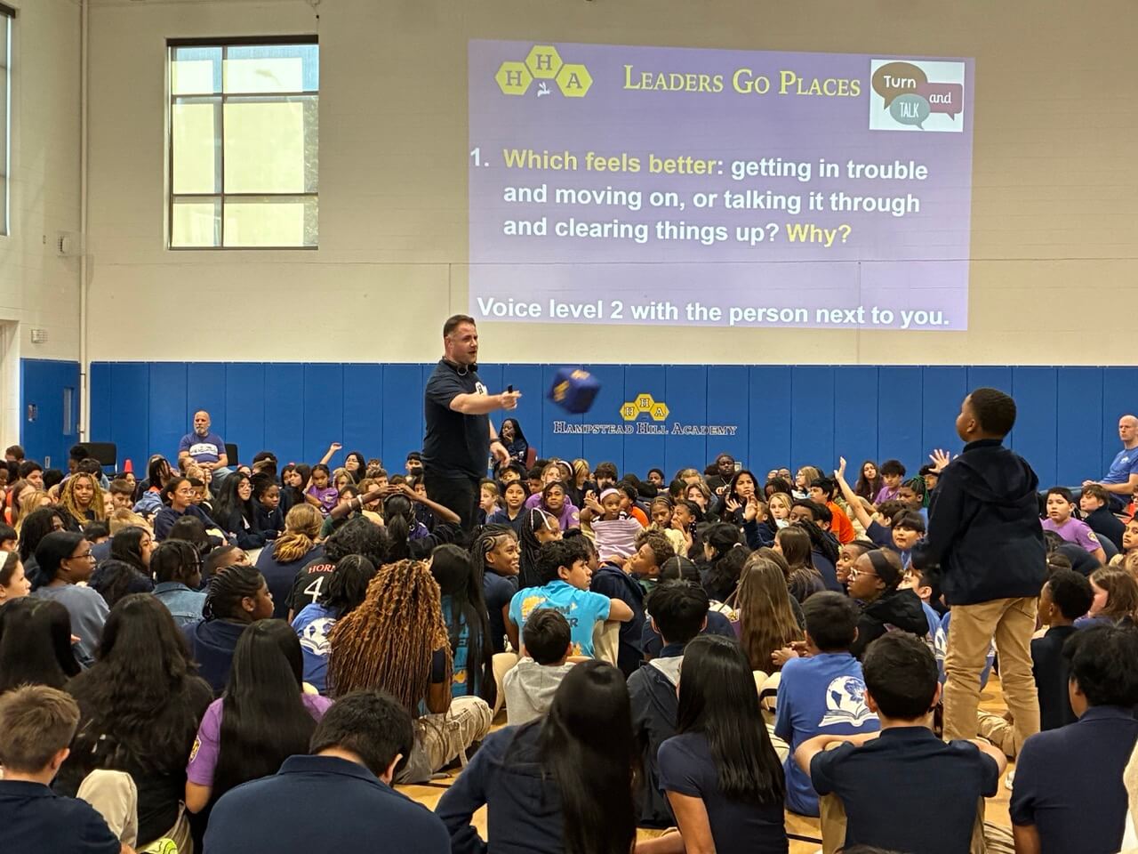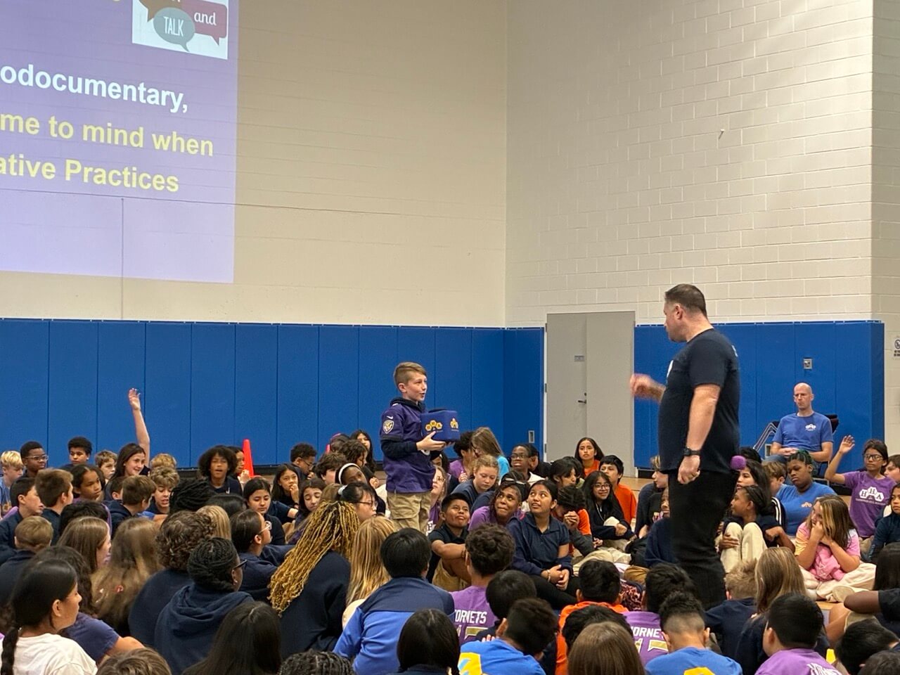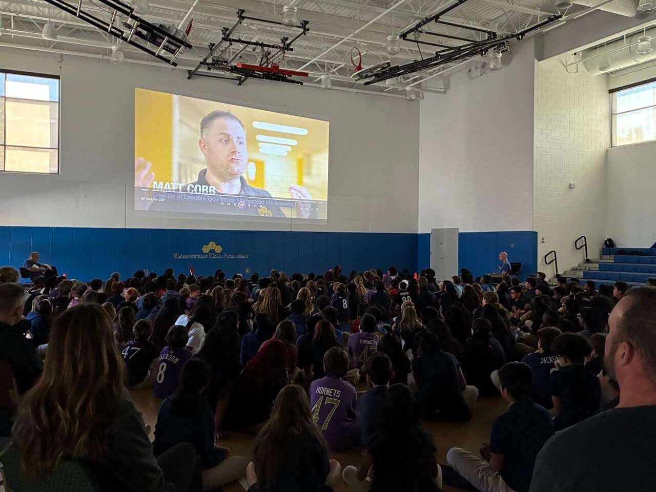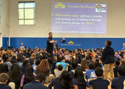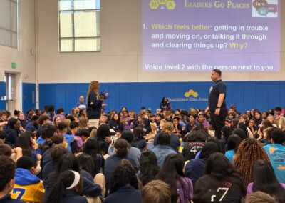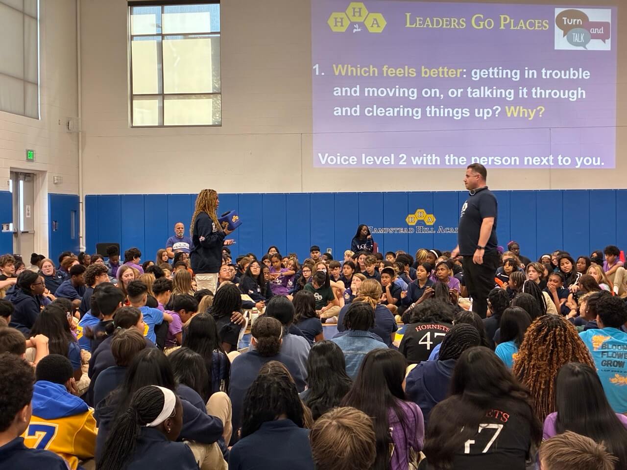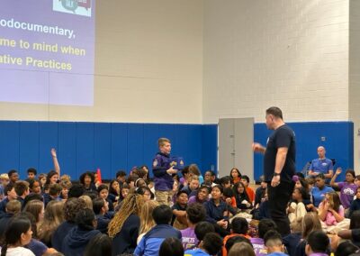 The City Springs Elementary / Middle School (CS) 8th grade joined their peers at Hampstead Hill Academy (HHA) on October 3, 2025, for an HHA Leaders Go Places (LGP) meeting in HHA’s Newstead Gym to view the new short documentary, “Restorative Practices Make Strong Schools.” The film, which was produced and funded through Voices for Restorative Schools, features CS and HHA students and teachers, and the impact of Restorative Practices.